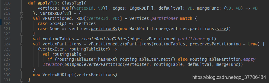 最终构建ShippableVertexPartition对象,构造参数(vids,values,vidsBitSet, routingTable),也就是(分区内点集合,分区内点属性,Bitset,路由表信息)。