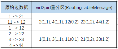 举栗子:以上面数据为例,将第一步生成的RoutingTableMessage重新分区后(按顶点ID哈希分区),分区0的数据有(2, 1, 1)(4, 1,1)(12, 0,2)(22,1,2)(44,1,2),分别表示(顶点ID, pid , pos),数据不一定有序,这里是按照从小到大装载。2个分区数据如下: