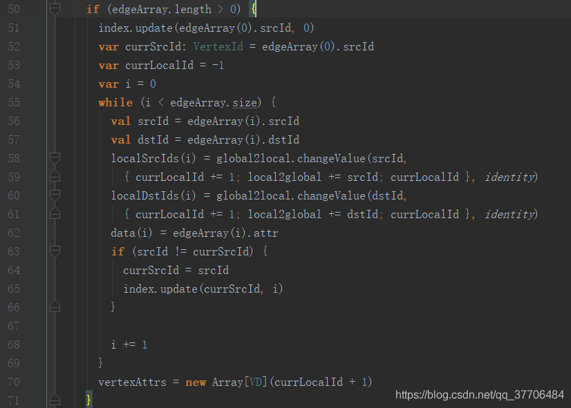 global2local.changeValue方法是类似upsert操作,参数(key, value ,mergFunc),如果key存在,则调用mergFun函数,如果key不存在,则放入key,value,最终都会返回global2local中key对应的点标。这里需要注意,value这里传入的是个函数{currLocalId += 1; local2global += srcId/dstId; currLocalId},只有当key不存在的时候,函数才会执行,currLocalId才会加1,local2global才会添加srcId/dstId,local2global数组下标就是点标