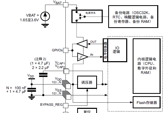 为了在 VDD 关闭后保留备份寄存器的内容,可以将 VBAT 引脚连接到电池或其它电源供电的可选备用电压。