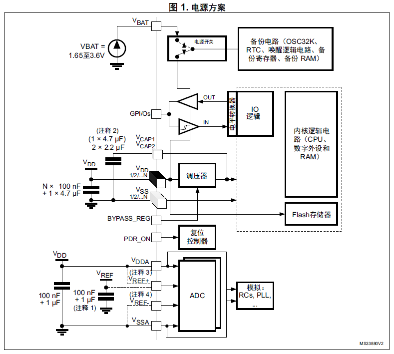 VBAT 电源的开关由复位模块中内置的掉电复位 (PDR)电路进行控制。