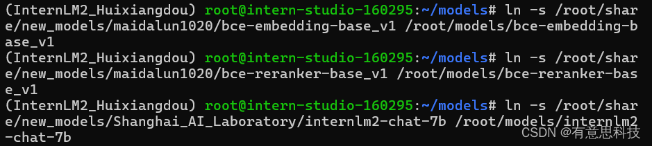 # 复制BCE模型 ln -s /root/share/new_models/maidalun1020/bce-embedding-base_v1 /root/models/bce-embedding-base_v1 ln -s /root/share/new_models/maidalun1020/bce-reranker-base_v1 /root/models/bce-reranker-base_v1 # 复制大模型参数(下面的模型,根据作业进度和任务进行**选择一个**就行) ln -s /root/share/new_models/Shanghai_AI_Laboratory/internlm2-chat-7b /root/models/internlm2-chat-7b