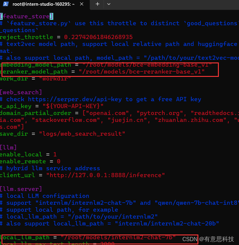 sed -i '7s#.*#reranker_model_path = "/root/models/bce-reranker-base_v1"#' /root/huixiangdou/config.ini