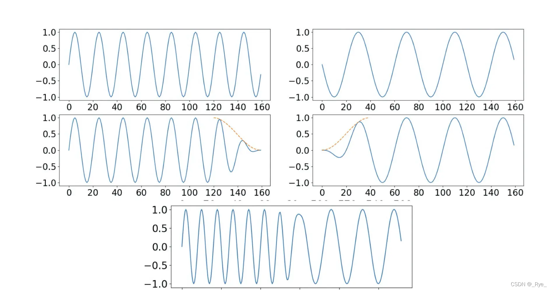 图 5 中橙色虚线表示交叉淡化用的淡化增益,第一第二行分别表示原始数据和交差淡化衰减后的曲线,最后一行是两帧重叠部分相加、拼接后得到的数据。