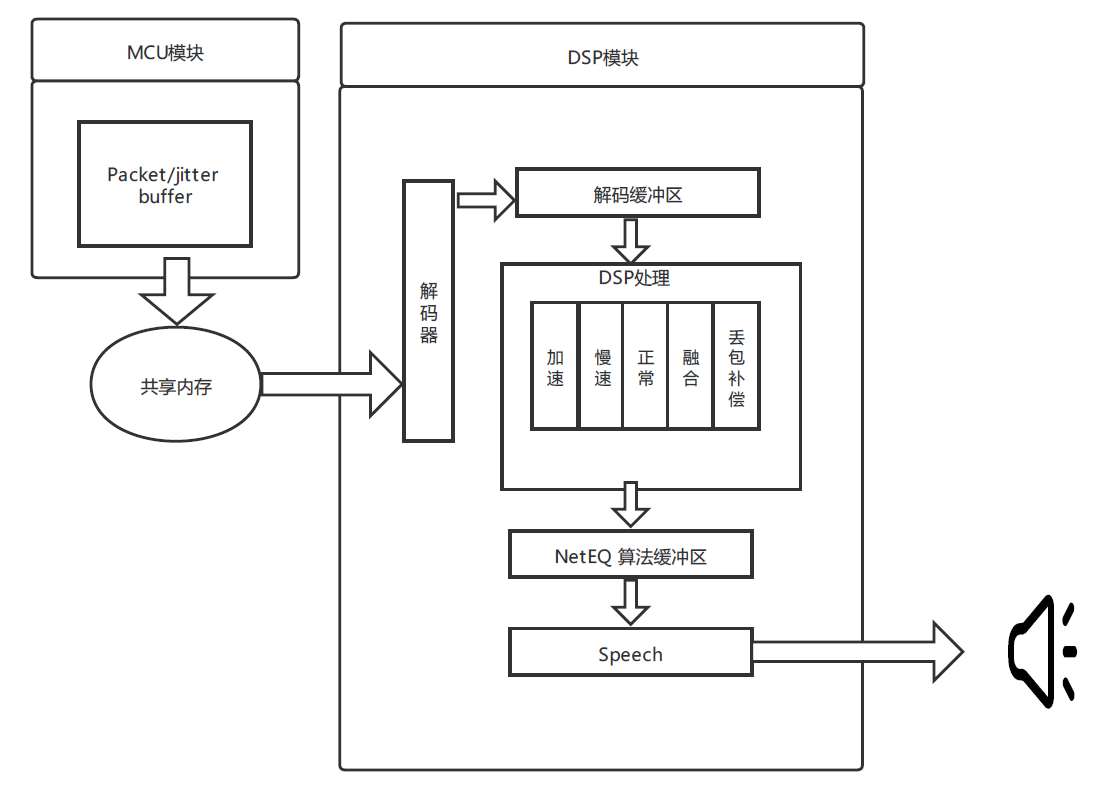 在 MCU 里的 Jitter Buffer(抖动缓存区)或者说 Pactet Buffer(数据包缓存区)就是通过开辟一个比较大的缓冲区域,让一段时间内到来的数据包在 Jitter Buffer 里存储、排序。然后按照播放顺序把数据包交给 DSP 中的解码器进行解码。