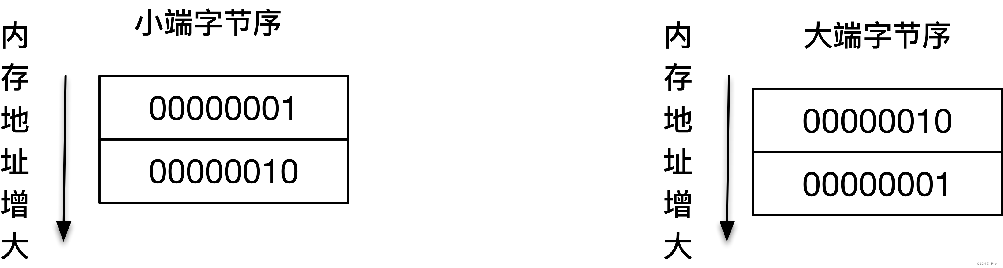 在计算机发展的历史上,对于如何存储这个数据没有形成标准。比如这里讲到的问题,不同的系统就会有两种存法,一种是将 0x02 高字节存放在起始地址,这个叫做大端字节序(Big-Endian)。另一种相反,将 0x01 低字节存放在起始地址,这个叫做小端字节序(Little-Endian)。