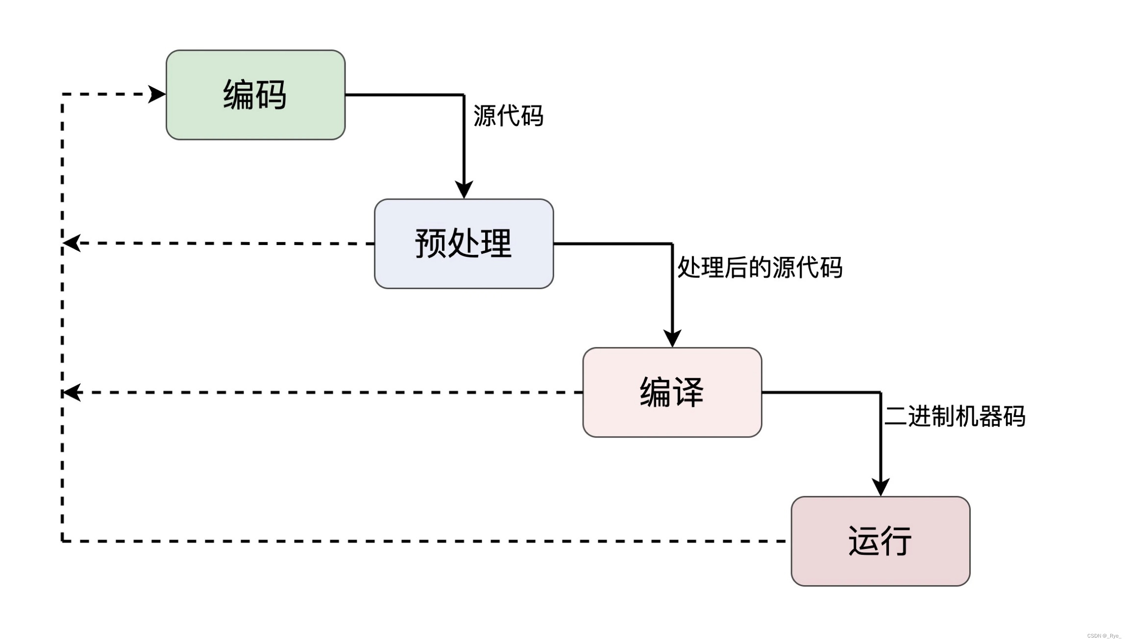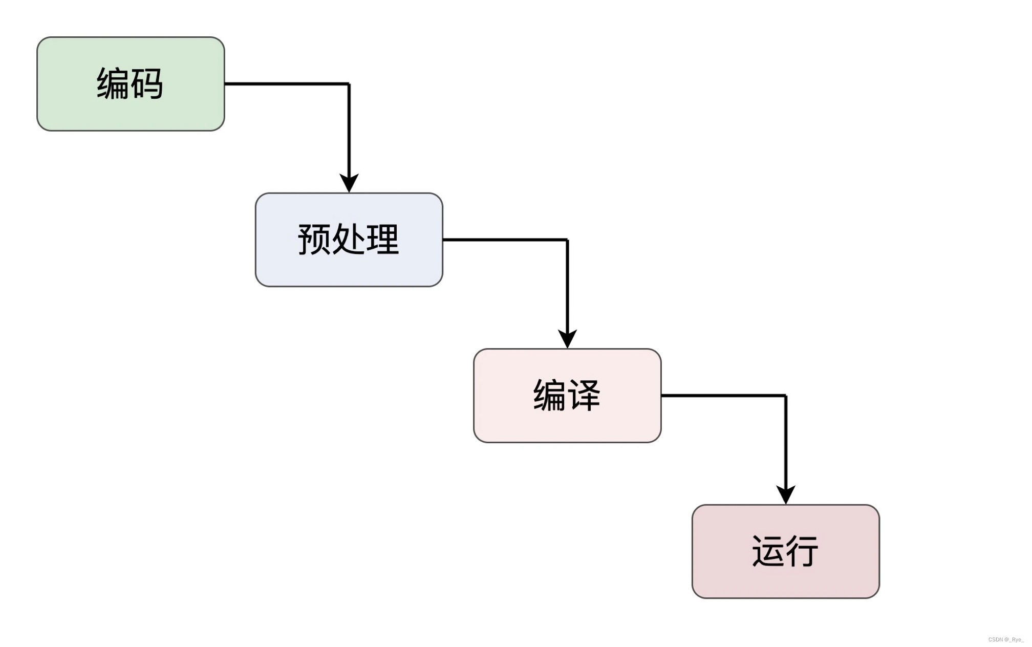 不过,因为 C++ 程序本身就已经处在“开发”阶段了,所以不会有“需求分析”“设计”这样的写文档过程。所以,一个 C++ 程序从“诞生”到“消亡”,要经历这么几个阶段:编码(Coding)、预处理(Pre-processing)、编译(Compiling)和运行(Running)。