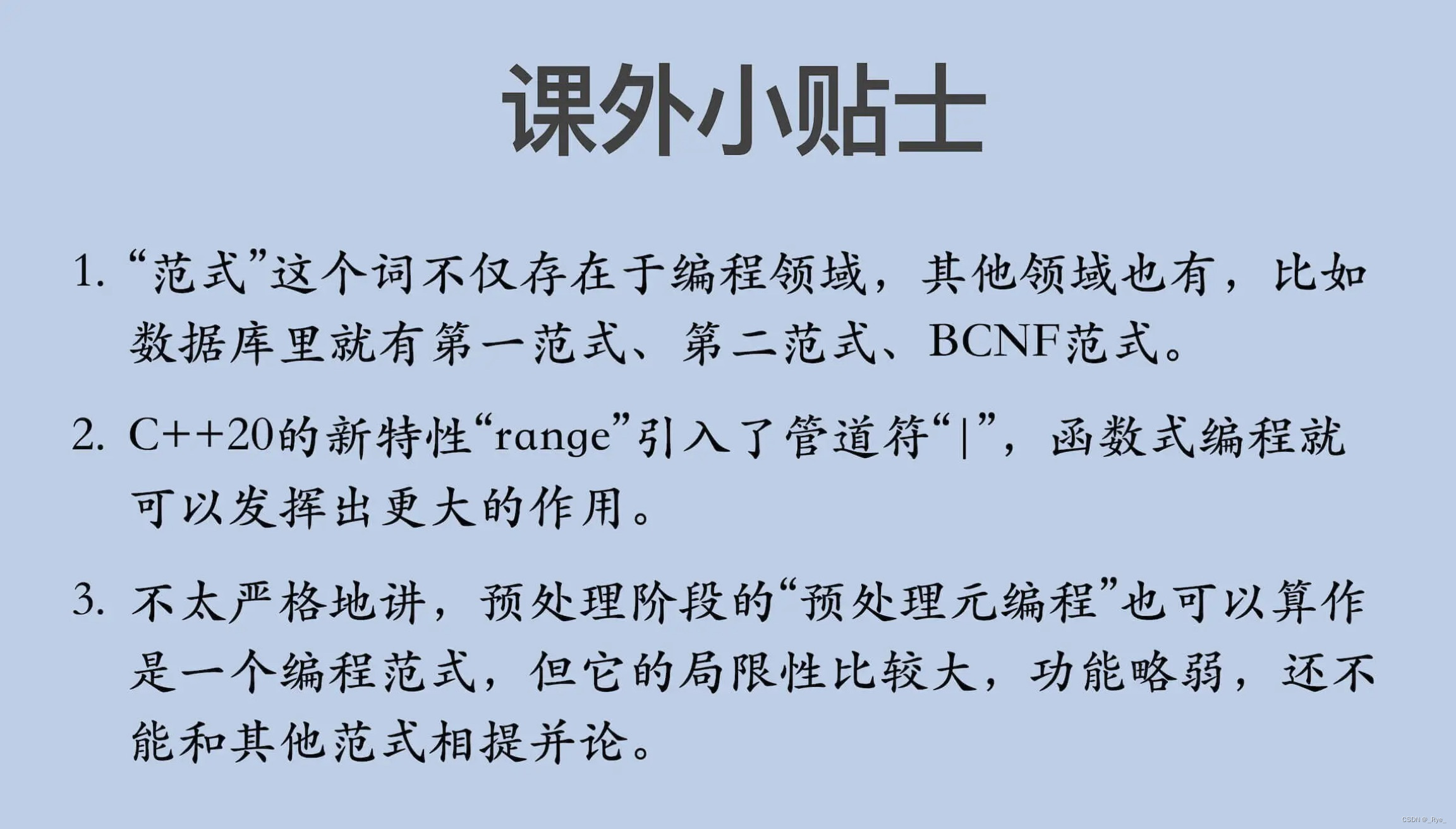 4. 在 C++ 里可以“无缝”混用多范式编程,但因为范式的差异比较大,必须小心谨慎,避免导致混乱。