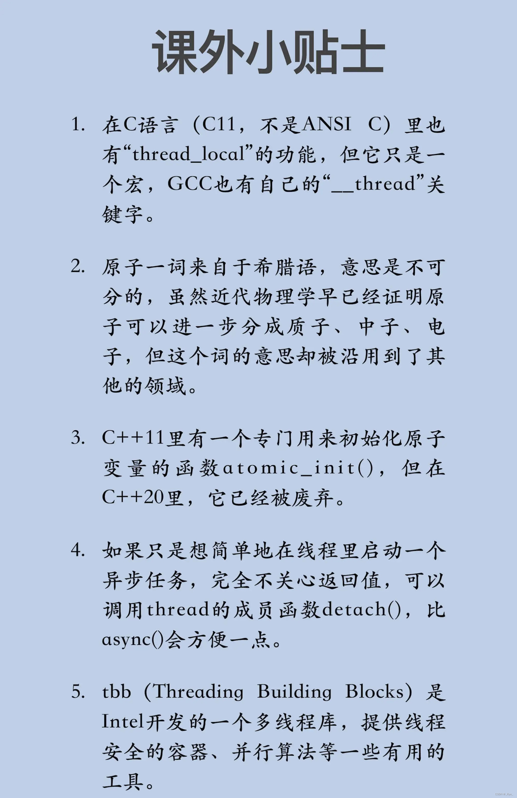 到现在我说了 call_once、thread_local 和 atomic 这三个 C++ 里的工具,它们都不与线程直接相关,但却能够用于多线程编程,尽量消除显式地使用线程。