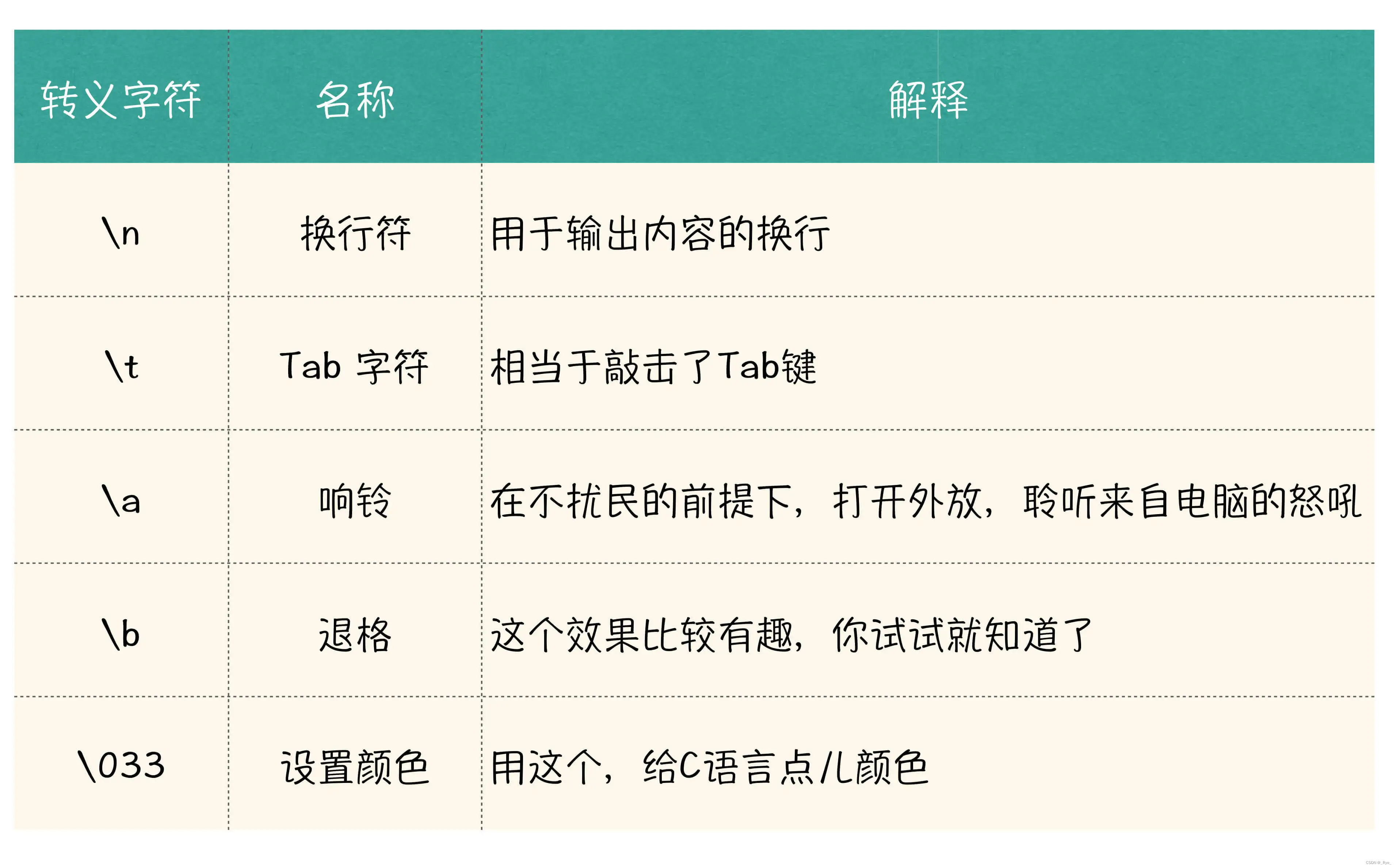 你要是使用过 Word 的话,应该知道 Tab 键吧,对,\t 的效果就相当于在相应位置敲击了 Tab 键, \n 的效果就相当于敲击了换行。在 C 语言中,\t、\n 都属于转义字符,还是和上面一样,它是 C 语言定义的规则,你也先不用问为什么,记住它,然后多用几次就可以了。下面这个表里,还给出了一些更多的转义字符,你可以拿来玩一玩。