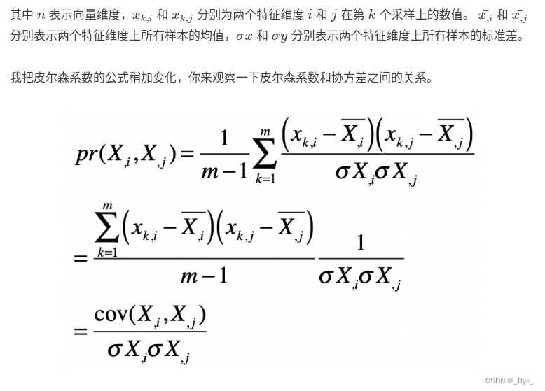你看,变换后的分子不就是协方差吗?而分母类似于标准化数据中的分母。所以在本质上,皮尔森相关系数和数据标准化后的协方差是一致的。