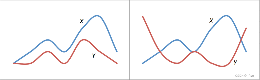 使用下面这张图,来表示正相关和负相关的含义。左侧 X 曲线和 Y 曲线有非常近似的变化趋势,当 X 上升 Y 往往也是上升的,X 下降 Y 往往也下降,这表示两者有较强的正相关性。右侧 X 和 Y 两者相反,当 X 上升的时候,Y 往往是下降的,X 下降的时候,Y 往往是上升,这表示两者有较强的负相关性。