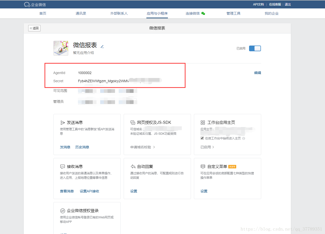 d) 准备好应用的AgentId和Secret (CorpSecret),如下图: