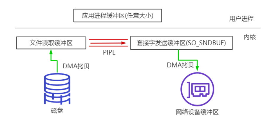 如下图所示,从磁盘读取到内核 buffer 后,在内核空间直接与 socket buffer 建立 pipe