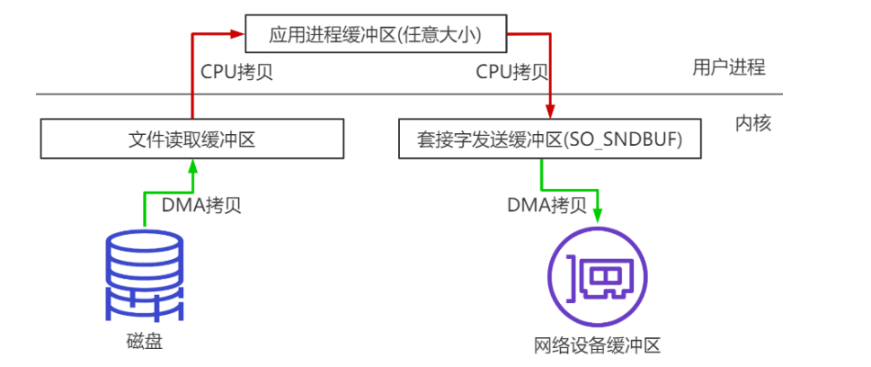比如:读取文件,再用 socket 发送出去,实际经过四次 copy。