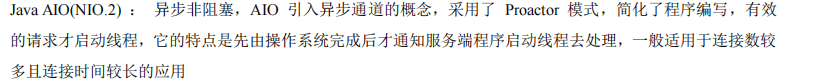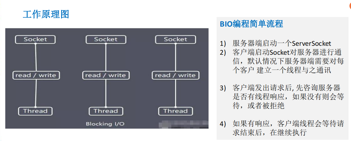 2) BIO(blocking I/O) : 同步阻塞,服务器实现模式为一个连接一个线程,即客户端有连接请求时服务器端就需要启动一个线程进行处理,如果这个连接不做任何事情会造成不必要的线程开销,可以通过线程池机制改善(实现多个客户连接服务器)。