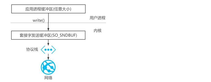 当某个应用进程调用 write 时,内核从该应用进程的缓冲区中复制所有数据到所写套接字的发送缓冲区。如果该套接字的发送缓冲区容不下该应用进程的所有数据(或是应用进程的缓冲区大于套接字的发送缓冲区,或是套接字的发送缓冲区中已有其他数据),假设该套接字是阻塞的,则该应用进程将被投入睡眠。