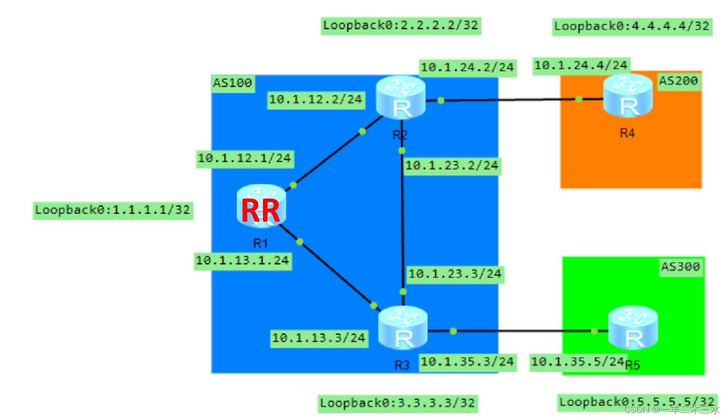 路由反射器RR:允许把从IBGP对等体学到的路由反射到其他IBGP对等体的BGP设备,类似OSPF网络中的DR。
