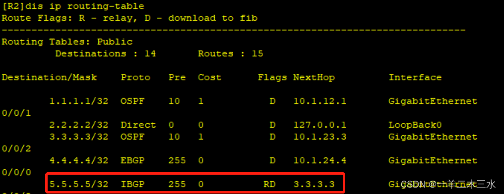 R2可以学到5.5.5.5/32的路由了,下一跳为3.3.3.3