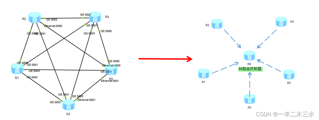 如下图,所有的路由器(R1-R5)只需和RR路由反射器(R6)建立IBGP邻居关系,并成为RR(R6)的client,就可以学到其他路由的路由了。以R1为例,R1通过RR路由器的反射,可以学习到所有R2、R3、R4和R5通告的路由。即减少了IBGP邻居的个数,也减少了对硬件资源的消耗。