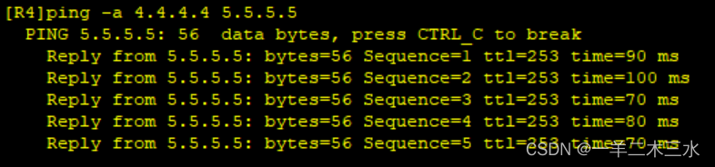 同时,R4通过EBGP学到了5.5.5.5/32路由,R5通过EBGP学到了4.4.4.4/32路由,可以ping通