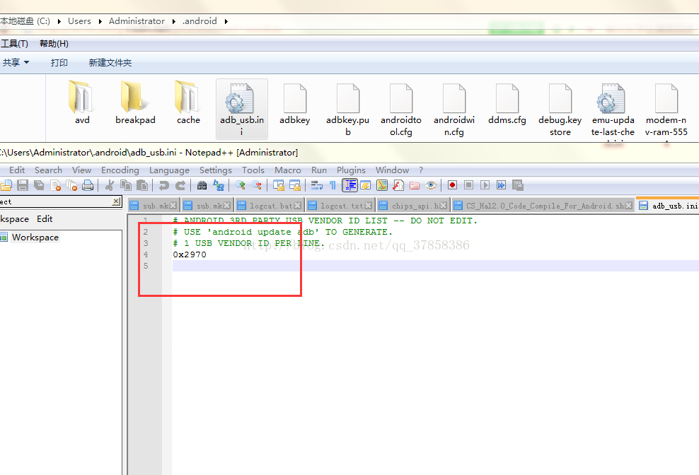 III、在C:\Documents and Settings\Administrator\.android目录下找到或新建一个adb_usb.ini文件,然后把VID的数值写入到adb_usb.ini 里面,就是0xVID(0x2970)。