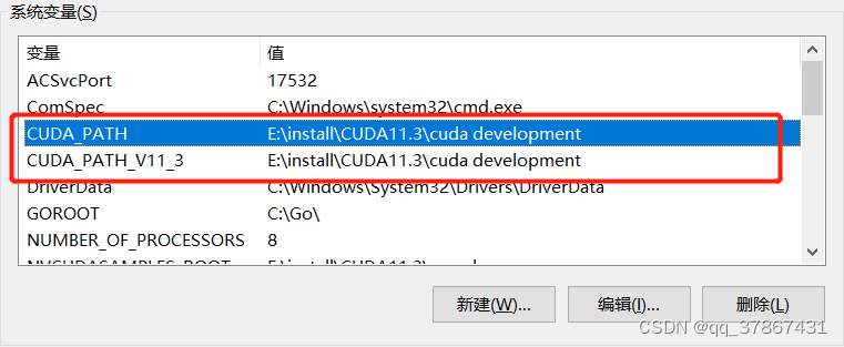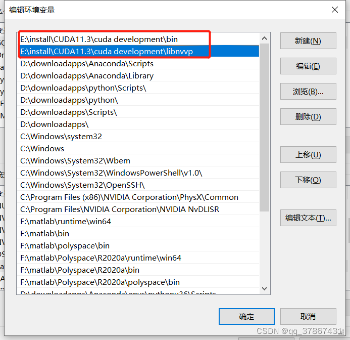 然后,在环境变量中添加cuda目录下的bin、lib、include、libnvvp路径