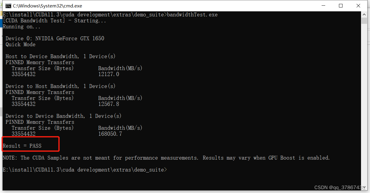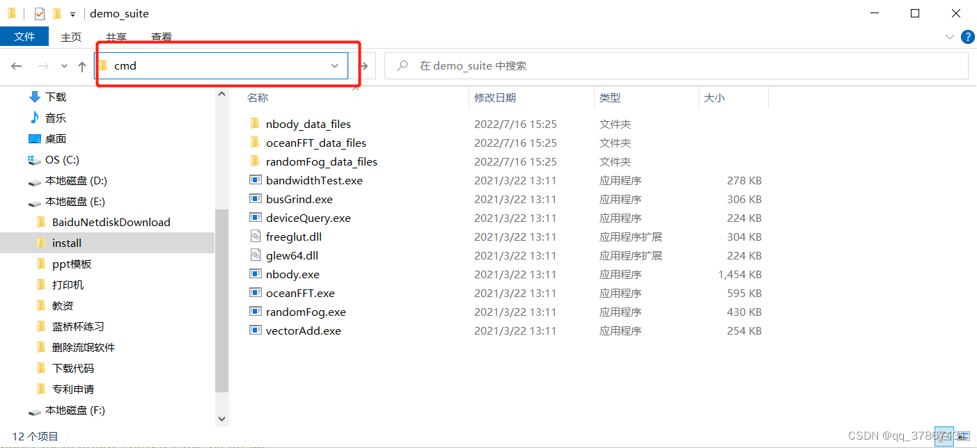 复制成功后,打开CUDA安装目录下的extras,然后打开demo_suit,然后在文件位置处输入cmd,能打开对应位置的命令行