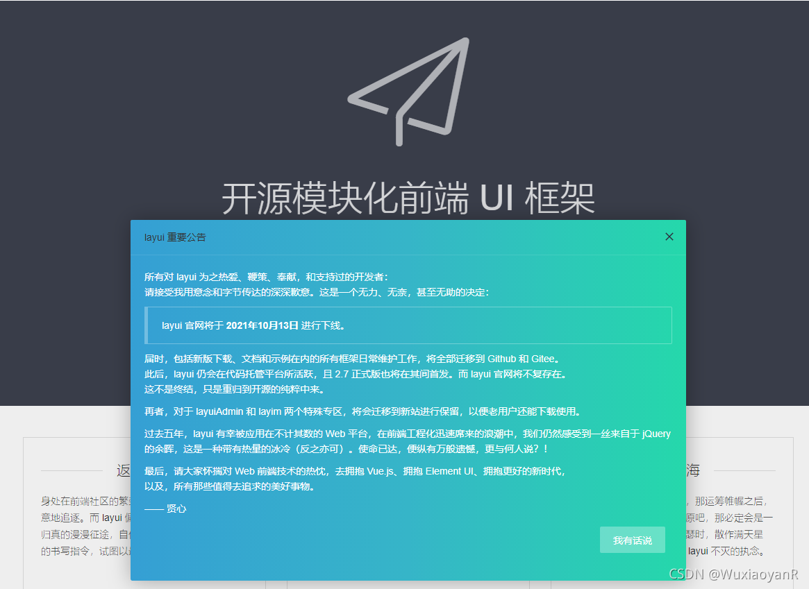 今天打开layu官网,已经提示{"code":"40510001","msg":"invisible bucket"}了。先前看到公告和现在打开官网之后什么都没有真的是两种心情。虽说只是官网下线,回归开源,但还是让人心生遗憾