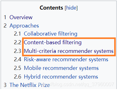 基于内容的推荐算法某些论文说的过于学术化,说简单点就是对 Item进行特征拆分,将这些特征做成tag标签或者向量,来匹配特定胃口的用户。而基于多准则的推荐算法呢?Wikipedia上说是系统预测用户对一个item的评分时会综合考虑多方面准则。那么问题来了,我Content-based也考虑了item的多方面特征,也考虑了用户多方面的偏好,那么两者有什么区别呢?