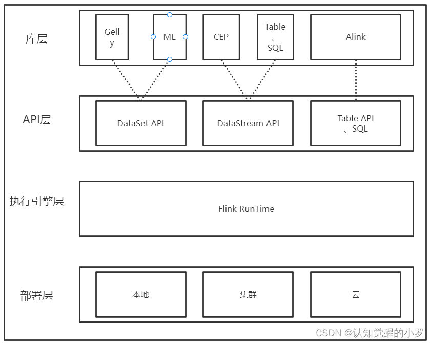 工具库层:在API之上,Flink还提供了丰富的工具。面向流处理的复杂时间处理CEP;面向批处理的机器学习库FlinkML、图处理Gelly;Table API和SQL,用户可以像操作表那样操作流数据;