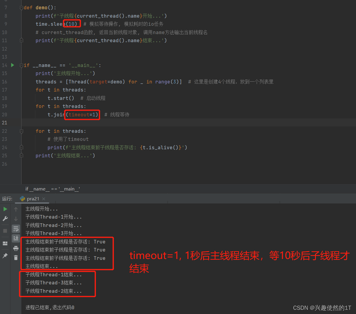 另外,join可以设置等待时间,使用参数timeout,timeout设置的时间到了后,主线程得到使用权,主线程结束。