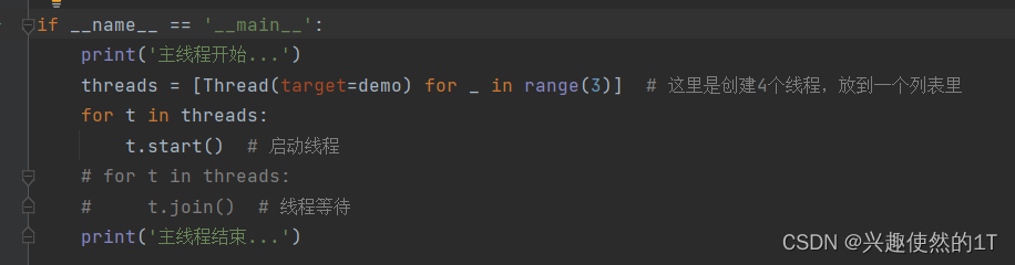 threads = [Thread(target=demo) for _ in range(3)] # 这里是创建3个线程,放到一个列表里