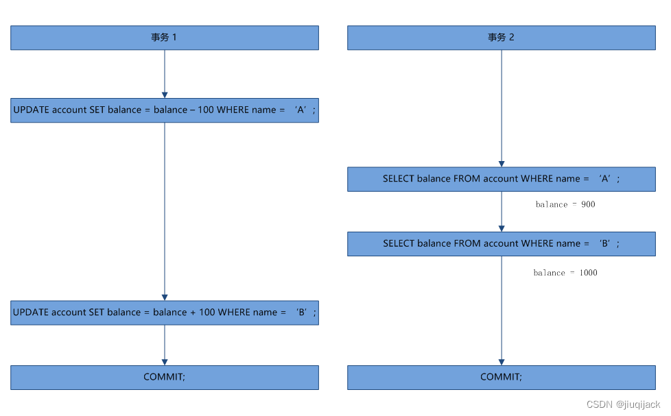 假设有两个事务,一个在进行转账操作,将 A 账户的 100 元转到 B 账户,同时有另一个事务在对 A 和 B 的账户余额进行求和统计,如下图所示: