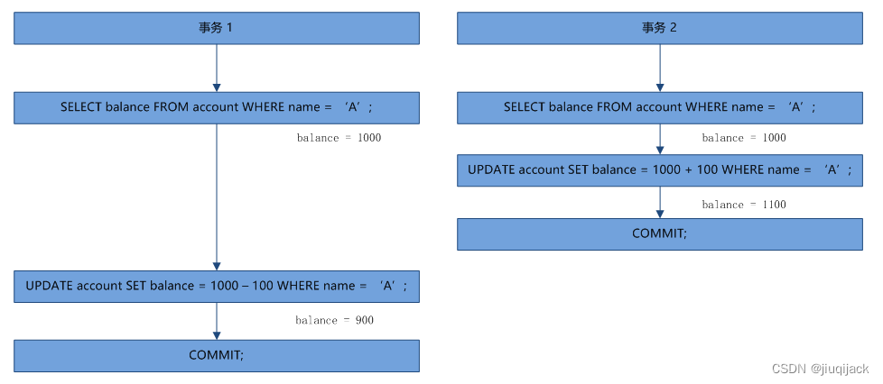 假设两个事务同时对 A 的余额进行修改,他们都查出 A 的当前余额为 1000,然后事务 2 修改 A 的余额,将 A 的余额加 100 变成 1100 并提交,这个时候 A 的余额应该是 1100,但是这个时候事务 1 并不知道 A 的余额已经变动,而是继续在 1000 的基础上进行减 100 的操作并提交事务,就这样事务 2 的提交被覆盖掉了,事务 1 提交之后 A 的余额变成了 900 元。这就是说事务 1 的提交覆盖了事务 2 的提交,事务 2 的 UPDATE 操作完全丢失了,整个过程如下图所示:
