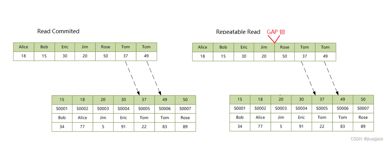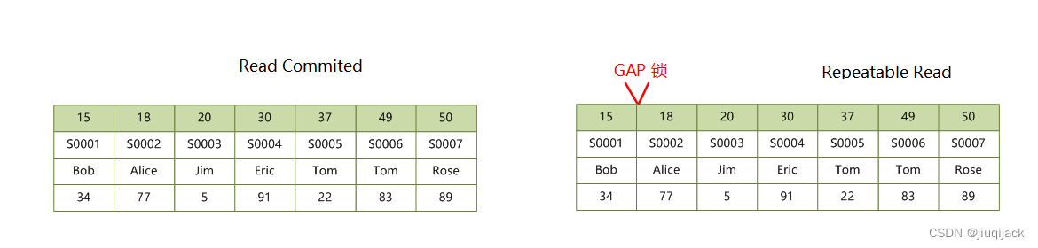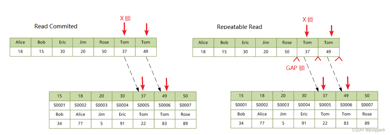 如果查询命中的是二级非唯一索引,在 RR 隔离级别下,还会加 GAP 锁。语句 UPDATE students SET score = 100 WHERE name = 'Tom' 加锁如下:
