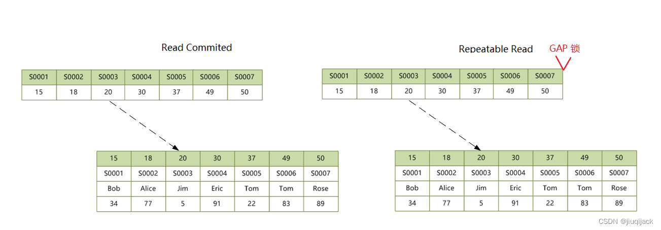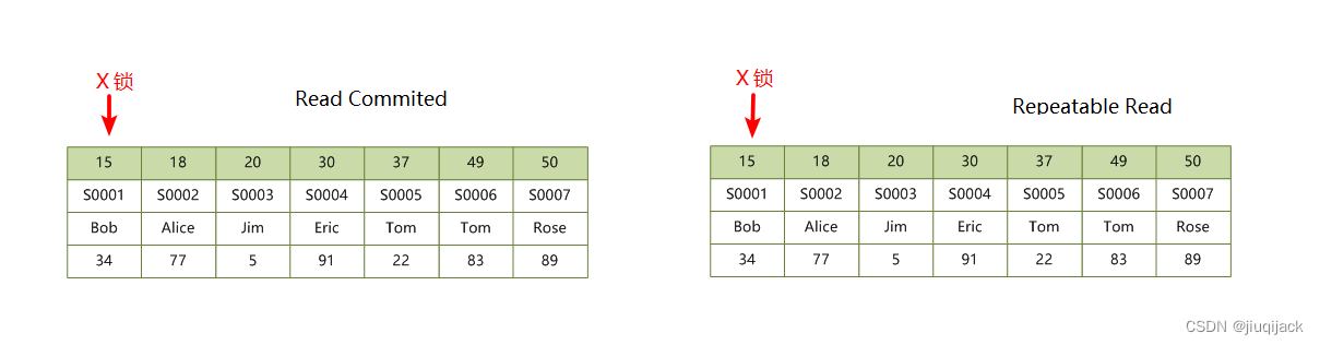 那么,为什么主键索引上的记录也要加锁呢?因为有可能其他事务会根据主键对 students 表进行更新,如:UPDATE students SET score = 100 WHERE id = 20,试想一下,如果主键索引没有加锁,那么显然会存在并发问题。