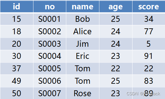 我们使用下面这张 students 表作为实例,其中 id 为主键,no(学号)为二级唯一索引,name(姓名)和 age(年龄)为二级非唯一索引,score(学分)无索引。