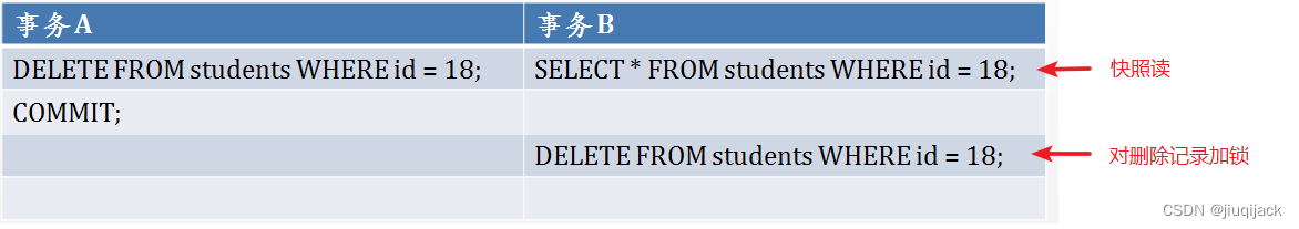 快照读后加锁 如下图所示,事务 A 删除 id = 18 这条记录,并提交。事务 B 在事务 A 提交之前有一次 id = 18 的快照读,所以在后面删除 id = 18 这条记录的时候就需要对已删除记录加锁了。如果没有事务开头的这个快照读,DELETE 语句就只是简单的删除一条不存在的记录。