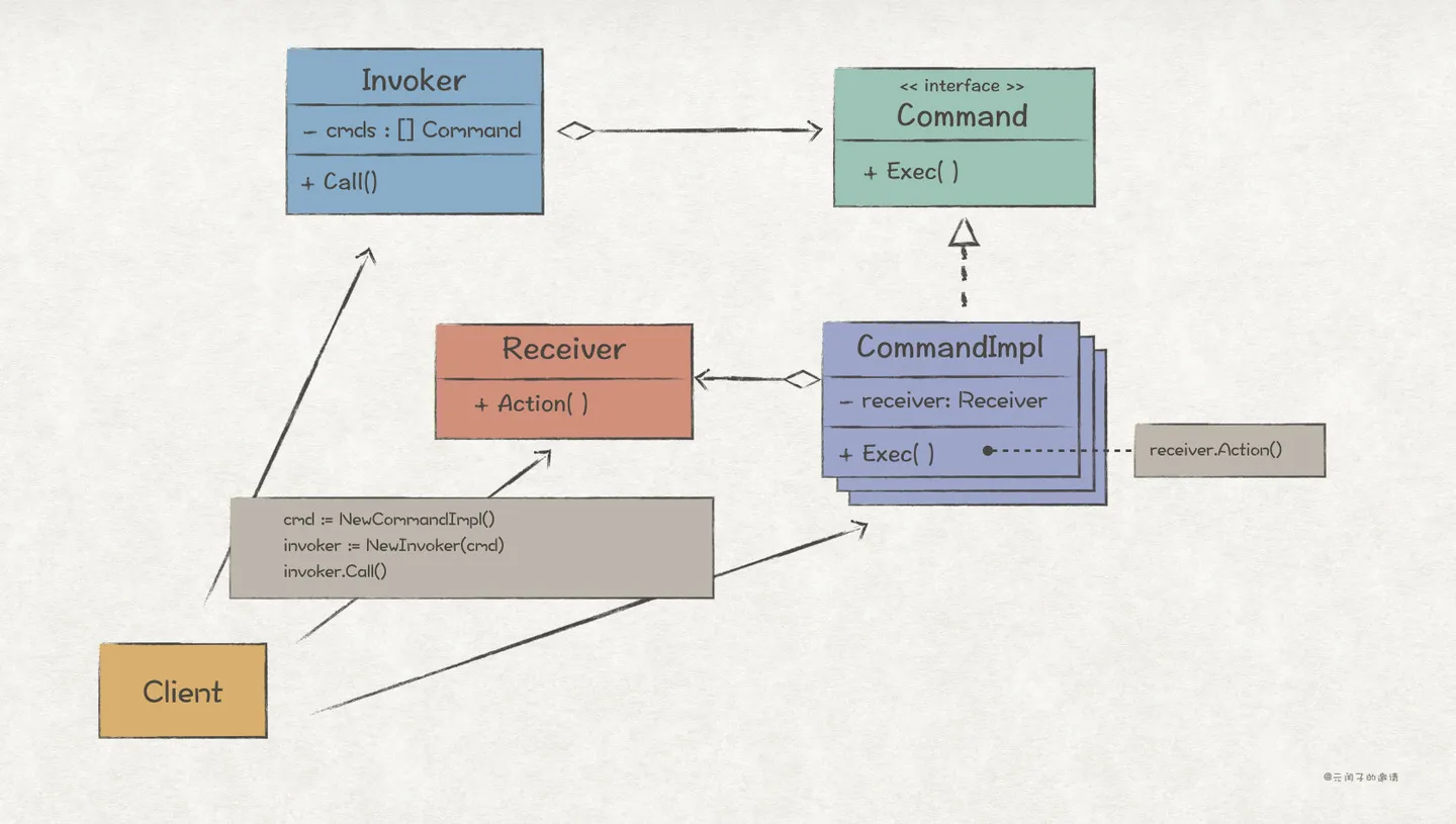 - 在 Invoker 对象持有 Command 的引用,本例子为 Command 的切片 cmds。