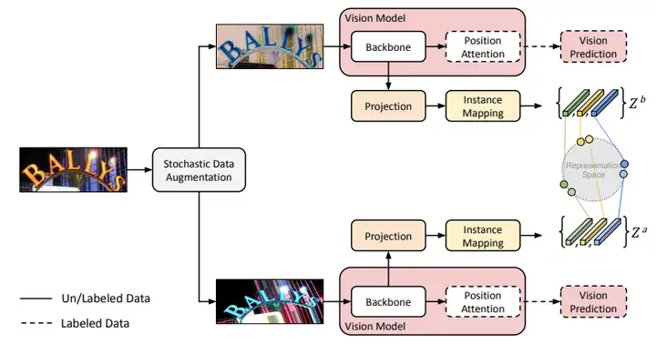 本文提出了一种针对文字识别的多模态半监督方法,具体来说,作者首先使用teacher-student网络进行半监督学习,然后在视觉、语义以及视觉和语义的融合特征上,都进行了一致性约束。