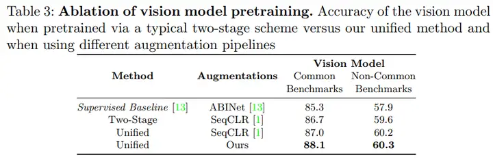 可以看到,在视觉预训练阶段,统一自监督预训练和强监督预训练比分阶段的训练效果要好。