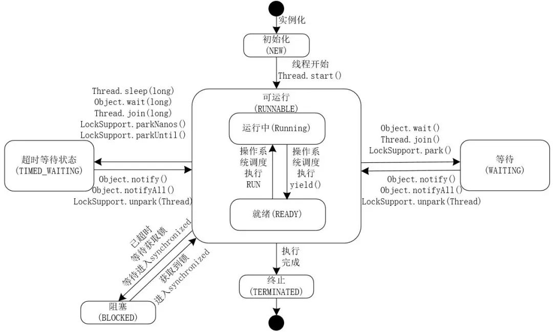 这里,有很多小伙伴不太明白为啥LockSupport.park();会导致thread01会永远阻塞。这里画了一张线程的生命周期图,如下所示。