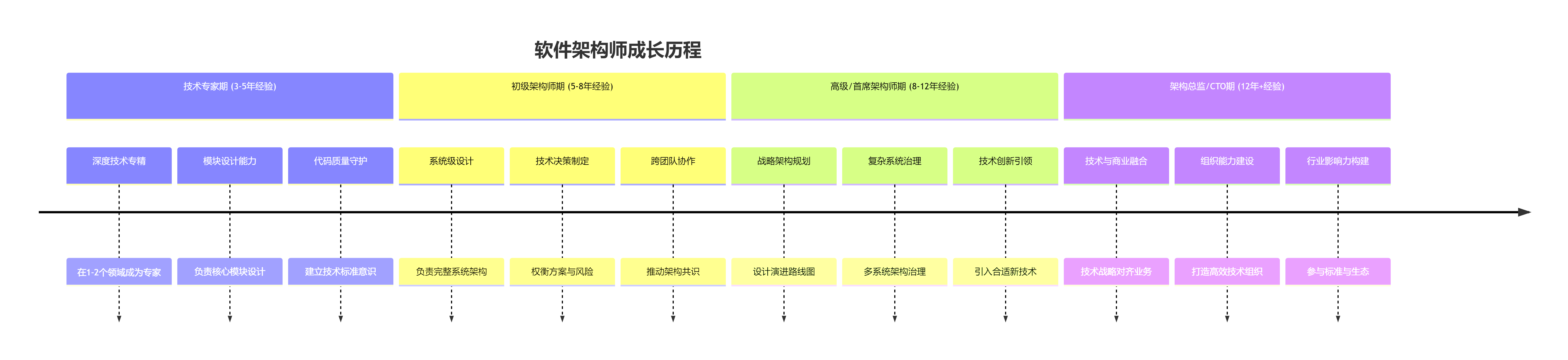 让我们先通过一个全面的成长框架,直观了解软件架构师从技术执行者到战略领导者的演进过程: