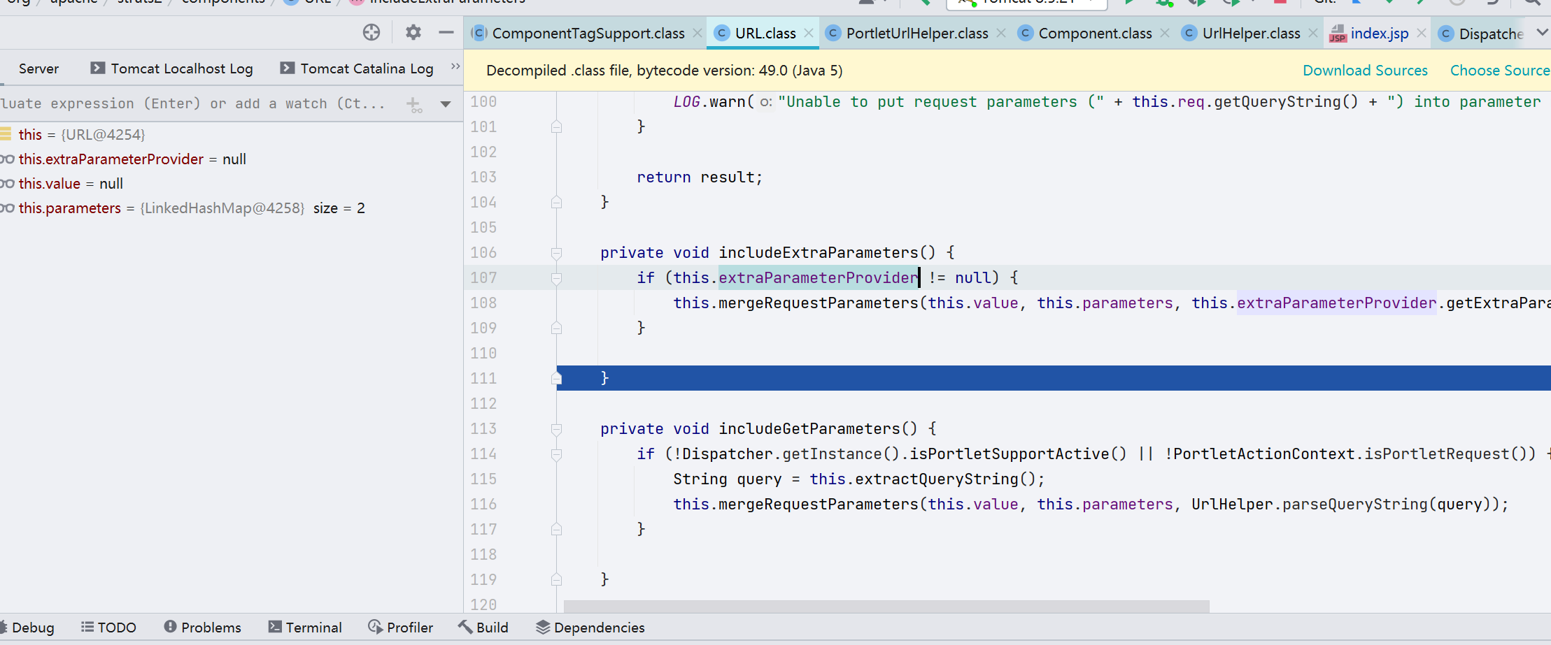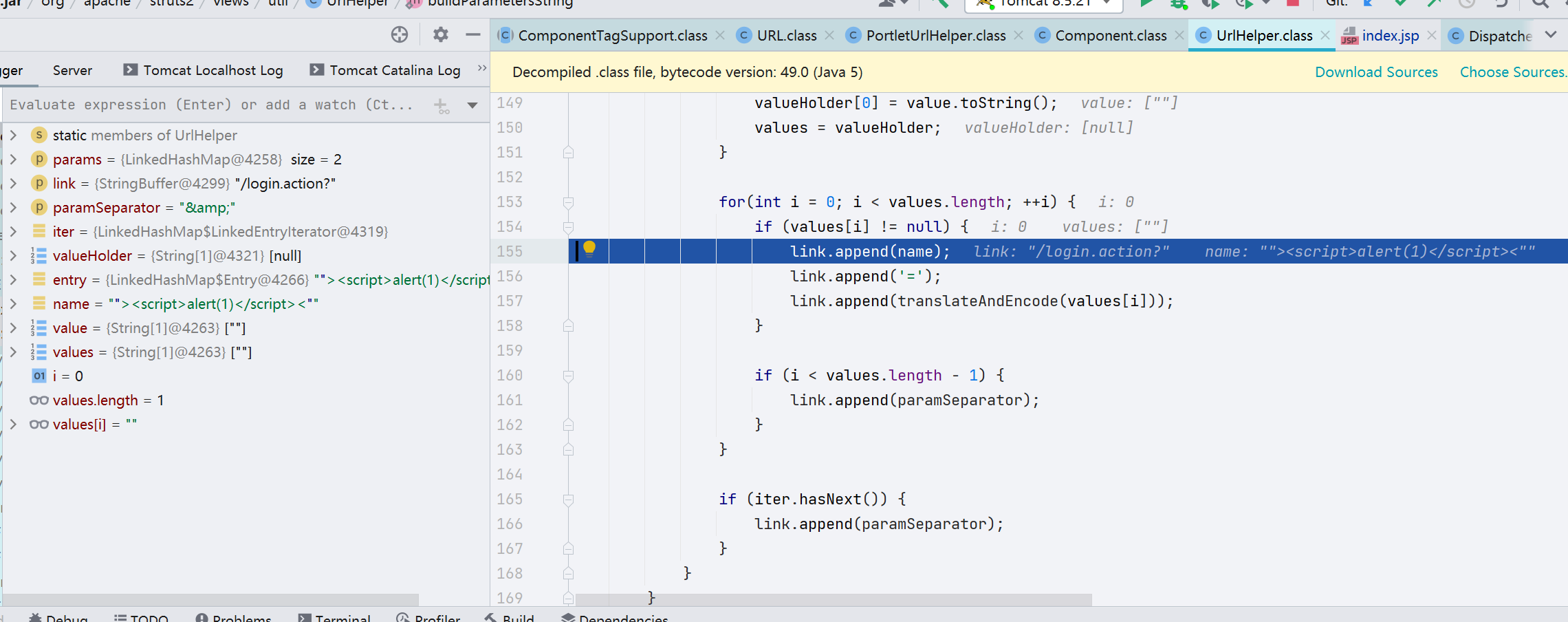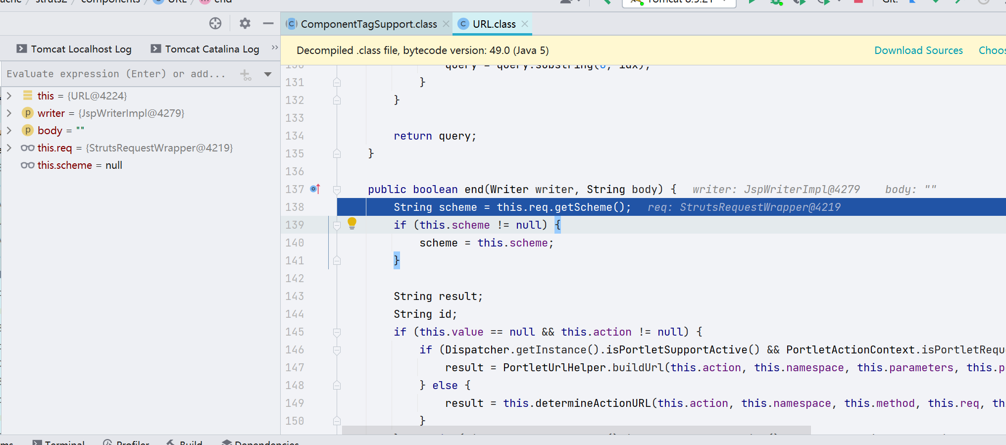 在执行完毕 doStartTag() 方法之后,会去到 doEndTag() 方法,我们跟进 this.component.end(),this.component 是 URL 类,所以也就是调用了 URL.end()