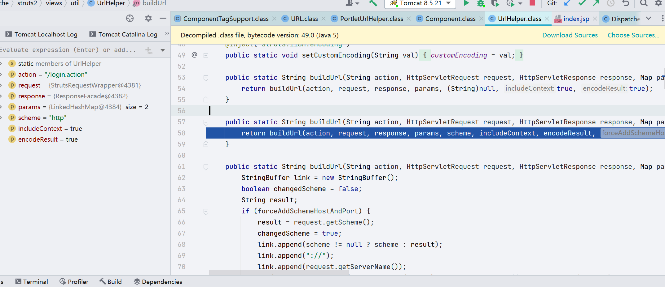 往下走,第 146 行,判断目前调度器(Dispatcher)的实例是否支持这一 Struts2 组件的行为,并且判断这一个请求是否需要 Struts2 组件调用某 Action 来处理;如果不需要调用 Action 处理,则直接进入 buildUrl() 的代码逻辑,如果需要 Action 来处理,会先去选择/调用 Action,再进行后续操作。