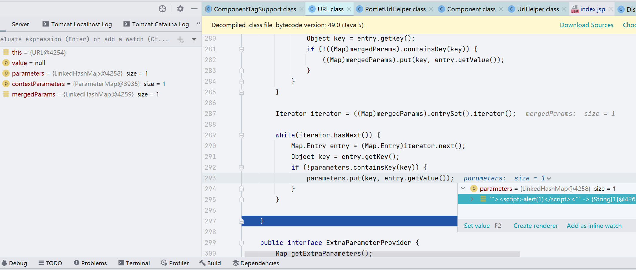 其实到这里漏洞出发点就来了,第一次调用 mergeRequestParameters() 方法的时候那一段参数是未经过 URL 编码的,从而产生了 XSS