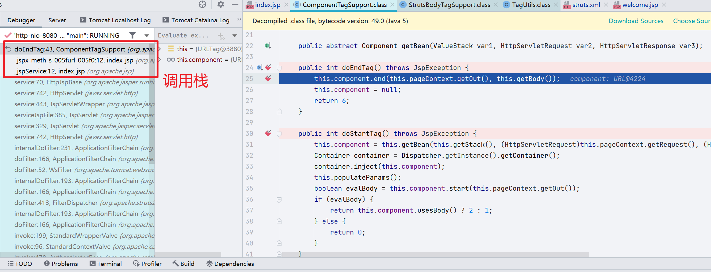 我们先下一个断点在 org.apache.struts2.views.jsp.ComponentTagSupport#doStartTag() 方法处,开始调试