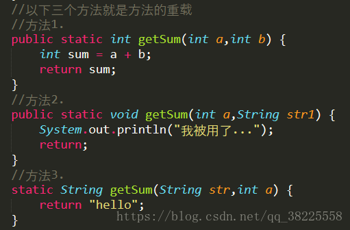 5.方法的重载: (在同一个类中,方法名相同,参数列表不同, 与返回值类型、形参中局部变量名和修饰符无关!!!)