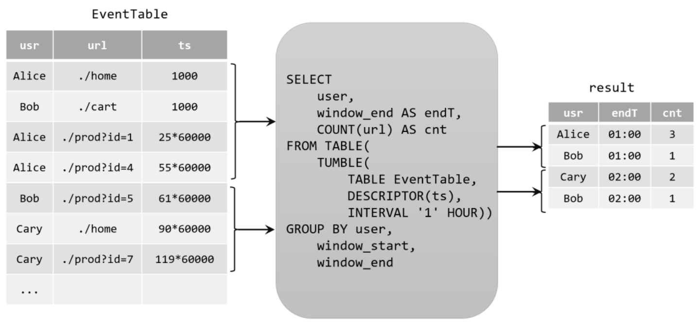 "TUMBLE( TABLE EventTable, " + // 1 小时滚动窗口